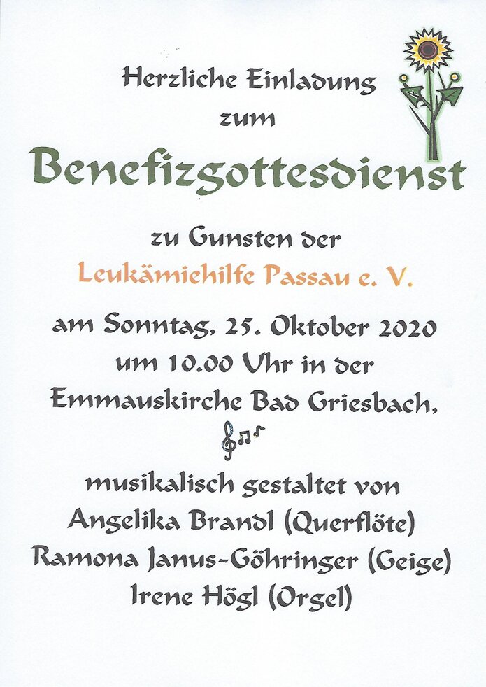 Am Sonntag, 25.10.2020 um 10 Uhr fand in der Emmauskirche - Bad Griesbach ein Benefizgottesdienst zu Gunsten der Leukämiehilfe Passau statt. Auf Einladung und unter Leitung von Irene Högl haben die 3 Damen Angelika Brandl (Querflöte), Ramona Janus-Göhringer (Geige) und Irene Högl (Orgel, Gitarre) den Gottesdienst melodisch und harmonisch einfühlsam musikalisch gestaltet. Thomas Rösch von der Leukämiehilfe Passau durfte nach der Begrüßung durch den evangelischen Pfarrer Klaus Stolz über den Verein, dessen Tätigkeit sowie anstehende Termine berichten. Statt einer Kollekte wurde nach dem Gottesdienst um eine Spende für den Leukämiehilfeverein gebeten, und so kamen mit 3 zusätzlichen Einzelspenden insgesamt 604,82 € zusammen. Vielen Dank! |