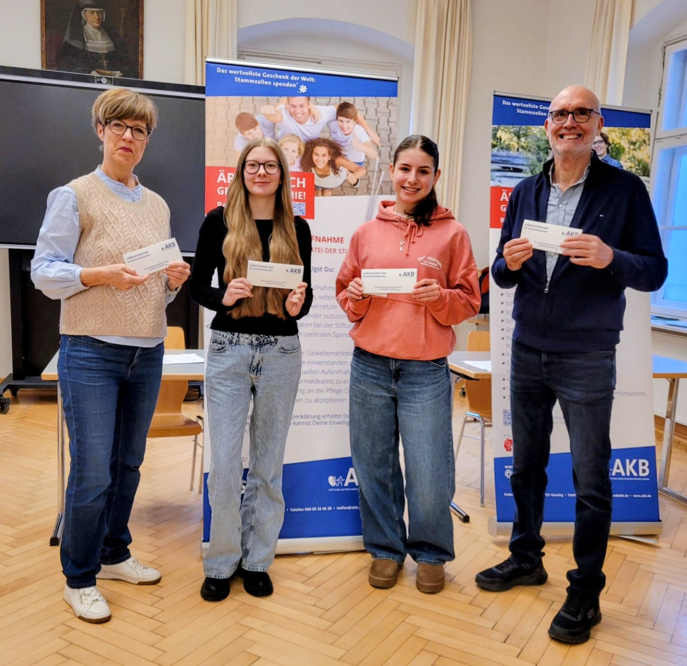 Am letzten Schultag vor Weihnachten fand im Gisela-Gymnasium eine Typisierungsaktion statt. Es konnten insgesamt 39 Typisierungen in der 13. Klasse durchgeführt werden. Außerdem übergaben die Schülerinnen den Erlös eines Pauseverkaufs - 340 € - als Spende für die Leukämie Hilfe Passau e.V. - an Annette und Gerhard Spitzenpfeil.